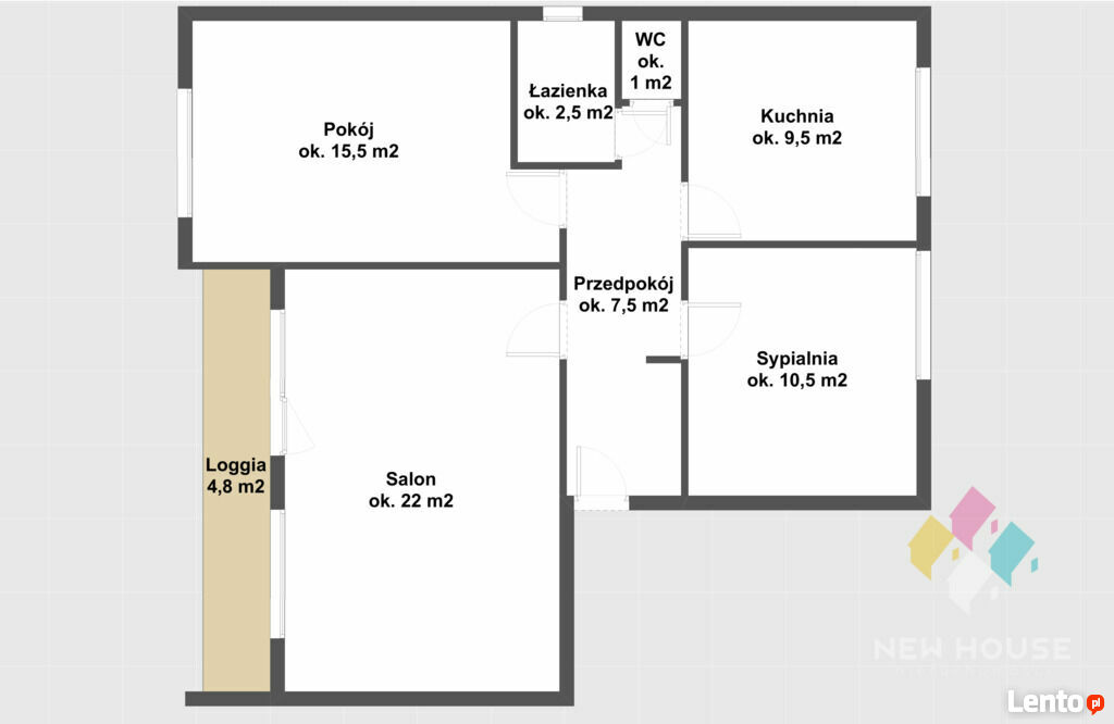 - Salon (ok. 22 m2) z wyjściem na balkon (loggię) o pow. 4,8 m2